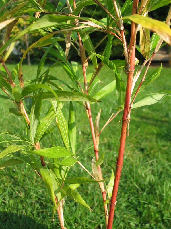 Winterhärte: gering (-14) Beschreibung: Ein leider wenig winterharter, ausläuferbildender Bambus, der nur an äußerst milden und geschützten Standorten ausgepflanzt werden sollte. Da meine eigene Pflanze noch relativ klein ist, werde ich sie zunächst erst einmal ein paar Jahre im Kübel halten (Überwinterung im Kalthaus). Der Name "marmorea" verweist auf die marmorähnliche Strukturierung der Halmscheiden hin, während sich der Zusatz "variegata" auf die weiss-panaschierten Blätter bezieht. Besonders attraktiv sind die Halme dieser Art, wenn sie unter dem Einfluss der Herbstsonne allmählich eine intensive kirschrote Farbe annehmen.