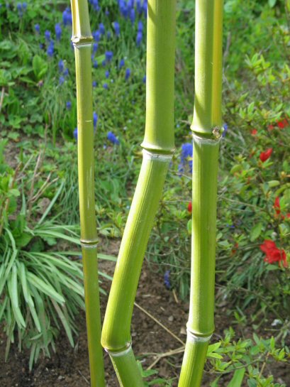 maximale Halmdicke: 3-4 cm Winterhärte: sehr gut (-25) Eigene Erfahrungen: Während Ph. aureosulcata ´spectabilis´ mittlerweile recht verbreitet ist, trifft man die grünhalmige Ursprungsform eher selten an. Mir gefällt an diesem Bambus zum einen der gelbe Sulcus, zum anderen besticht Ph. aureosulcata mit einer hervorragenden Winterhärte. Die Verwandschaft zu Ph. aureosulcata ´spectabilis´ ist förmlich spürbar, wenn man mit der Hand die rauen Halme entlangfährt. Beide Formen zeigen auch eine ausgeprägte Tendenz zu Zickzackwuchs. Mittlerweile weiß ich, daß Zickzackwuchs vor allem dann auftritt, wenn Ph. aureosulcata keine ausreichende Bodenfeuchtigkeit vorfindet, also bei "Wassermangel". |