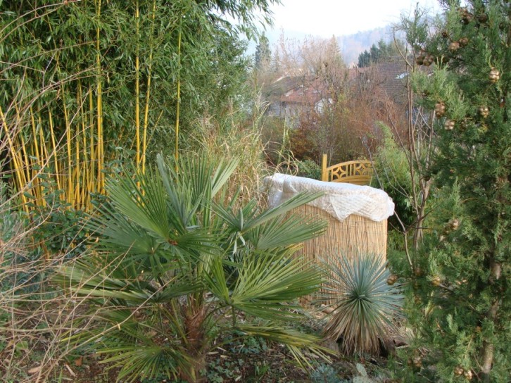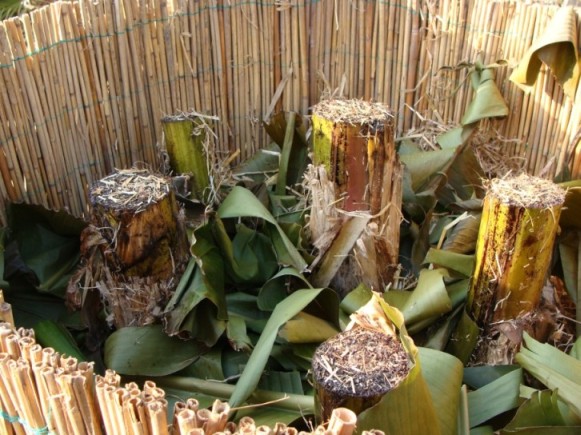Schritt 2: Im Innernen wird bis zu einer Höhe von ca. 20 cm mit Rindenmulch aufgefüllt. (Bei musa sikkimensis zu empfehlen, nicht unbedingt notwendig bei musa basjoo.) Anschliessend: Verfüllung mit einem Gemisch aus 2 Teilen Stroh und einem Teil Bananenblätter. Dieses Gemisch hält Kälte besser ab als reines Stroh, da sich zum einen Verrottungswärme bildet und zum anderen der Wasseranteil in den Blättern Temperaturschwankungen abpuffert.