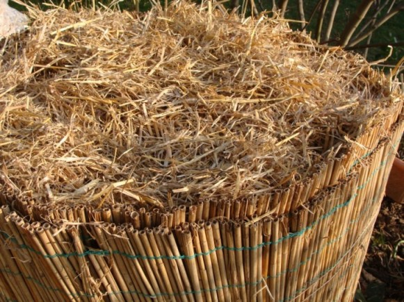 Schritt 3: Als oberste Schicht wird nochmals Stroh aufgefüllt. Danach: Verschliessen mit Luftpolsterfolie, die mit einer Schnur rundrum befestigt wird.