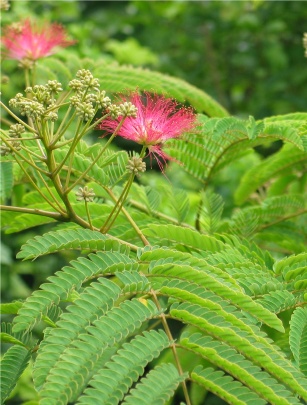 Albizia julibrissin ´rouge´Die sogenannten Seidenbäume (Albizia julibrissin) gehören zu einer Gattung aus der Unterfamilie der Mimosengewächse und sind zudem eng verwandt mit den Akazien. Obwohl ihre Verbreitung nicht auf den Mittelmeerraum beschränkt ist, sind sie südlich der Alpen häufig anzutreffen, wo sie im Sommer duch ihre filigranen, mimosenartigen Blüten bezaubern. Aufgrund des mimosentypischen Verhaltens, über Nacht ihre Blätter zusammenzufalten, werden Albizien auch als Schlafbäume bezeichnet. Winterhärte: ca. -18 Grad.