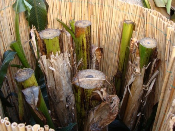 Schritt 2: Im Innernen wird bis zu einer Höhe von ca. 20 cm mit Rindenmulch aufgefüllt. (Bei musa sikkimensis zu empfehlen, nicht unbedingt notwendig bei musa basjoo.) Anschliessend: Verfüllung mit einem Gemisch aus 2 Teilen Stroh und einem Teil Bananenblätter. Dieses Gemisch hält Kälte besser ab als reines Stroh, da sich zum einen Verrottungswärme bildet und zum anderen der Wasseranteil in den Blättern Temperaturschwankungen abpuffert.