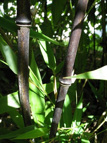maximale Halmdicke: 2-3 cm Winterhärte: ausreichend (-18) Eigene Erfahrungen: Ph. nigra ´punctata´ ist im Gegensatz zu nigra ´boryana´ deutlich kleinwüchsiger und auch weniger winterhart. Die neuen Triebe treiben erst recht spät aus (Ende Mai oder Anfang Juni) und sind zunächst vollkommen grün. Nach einigen Monaten erscheinen kleine schwarze Punkte (daher der Name), die immer mehr an oberhand gewinnen, bis schließlich der gesamte Halm schwarz gefärbt ist (nach ca. 1-2 Jahren). Mir gefällt an diesem Bambus zum einen seine ungewöhnliche Halmfärbung, zum anderen aber auch sein kleinblättriges, zartes Laub. Zu meiner eigenen Überraschung gab es bisher so gut wie keine Winterschäden an diesem Bambus - auch nicht in härteren Wintern wie 2001/2002 (Temperaturen bis -17 Grad). Ich führe dies darauf zurück, daß die Pflanze an einer Stelle wächst, an die nur im Sommer viel Sonnenlicht gelangt, während es im Winter dort eher schattig ist. |
